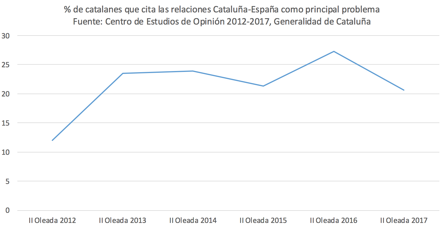 Según la última entrega de dicho barómetro, el porcentaje de catalanes que menciona las relaciones Cataluña-España como el principal problema de la actualidad alcanza un 20,6%. Se trata del nivel más bajo observado desde 2012, lo que podría apuntar que, ahora sí, el suflé está empezando a desinflarse.