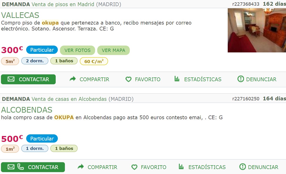 Como si de un mercado inmobiliario propio se tratara, junto a los oferentes se sitúan los demandantes. Y es que son muchos los usuarios que buscan a un experto que les proporcione una casa que poder okupar en ubicaciones como Vallecas, Alcobendas o Barcelona. El precio más habitual que ofrecen por instalarse en las viviendas de otro propietario es de 500 euros.