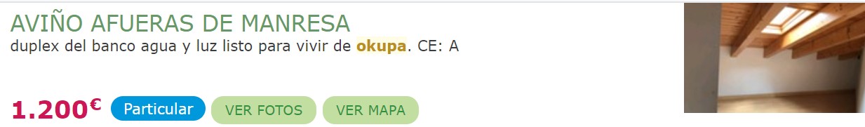 "Dúplex del banco con agua y luz. Listo para vivir de okupa". Así, como si del cartel de una inmobiliaria se tratara, reza un mensaje en el conocido portal Milanuncios.com. Según el texto publicado hace 9 días, la vivienda está situada en Manresa, un municipio de la provincia de Barcelona, y los interesados que quieran habitarla ilegalmente solo tienen que pagar 1.200 euros al anunciante.