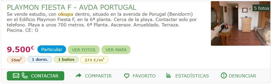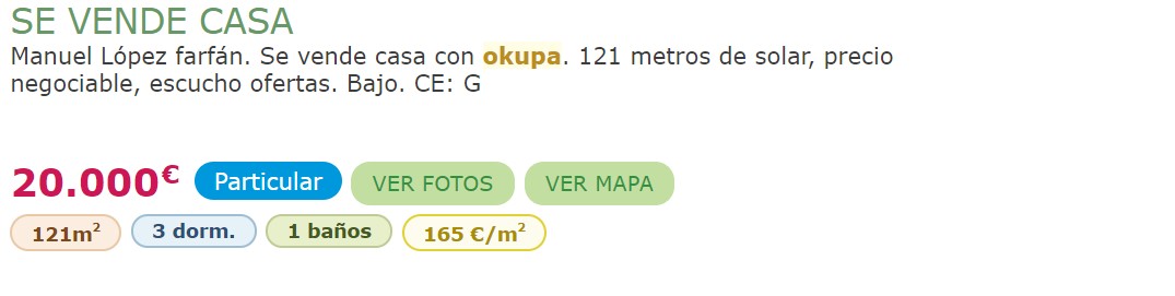 Como una vez que las viviendas son okupadas los dueños se ven obligados a pasar por un calvario legal para conseguir echar a sus nuevos habitantes, son muchos los que deciden deshacerse de su propiedad poniéndola a la venta. "Se vende casa con okupa", dice un anuncio de hace 2 días. Se trata de una vivienda de 3 dormitorios en San Juan de Aznalfarache (Sevilla) que está a la venta por 24.000 euros. El precio de venta es tan ajustado porque la persona que adquiera el inmueble tendrá que lidiar con estos residentes ilegales. Otro ejemplo de la rebaja del precio deben de hacer los propietarios para darle salida al mercado a sus viviendas es un estudio en Benidorm "con okupa dentro" y "a 700 metros de la playa" que se vende por 9.500 euros.