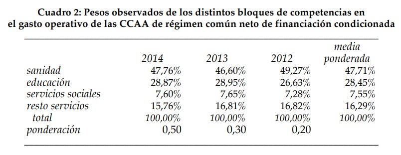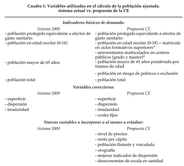 Pero las cosas no son tan sencillas. Porque no es lo mismo un habitante que otro. Por ejemplo, en sanidad y servicios sociales, las regiones con una población más envejecida gastan más. Y en educación, las que tengan más alumnos matriculados. Por eso, para el cálculo de la financiación se usa una ponderación que da lugar a lo que se denomina como "población ajustada". ¿Y qué criterios se tienen en cuenta? Los que aparecen en el anterior cuadro, que incluye tanto las variables del sistema del 2009 como las propuestas por la Comisión de Expertos (CE) convocada por el Gobierno. Son muchos criterios diferentes y cada región tira para que el suyo (el que le beneficia más) sí entre en el cálculo y se caigan los que le perjudican. Todas hablan de "objetividad" y apelan a una discusión técnica, pero es evidente que aquí, en estos detalles está la clave que determinará quién gana y quién pierde.