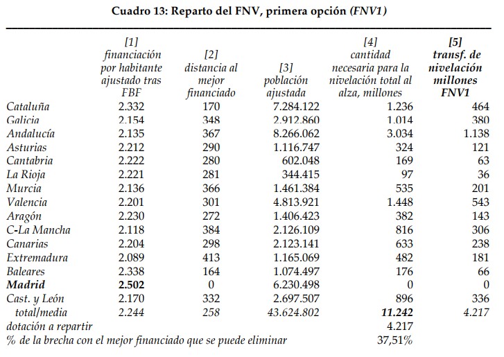 El tercer cuadro es interesante. Muestra cuál sería la financiación por habitante tras el reparto del principal fondo del nuevo sistema propuesto por los expertos. Luego, queda el llamado Fondo de Nivelación (FNV) para igualar algo (o todo) lo que cada región recibe por habitante ajustado. Según los cálculos de De la Fuente, con el modelo propuesto habría unos 4.217 millones para repartir, pero la brecha de gasto necesitaría de más de 11.000 millones para cerrarse. O por decirlo de otra manera, para que todas las comunidades tengan los mismos recursos por habitante ajustado, el Estado tendrá que destinar 11.000 millones al sistema de financiación. Es viable, pero implica un esfuerzo presupuestario que saldría de otras partidas. Otra decisión política complicada.