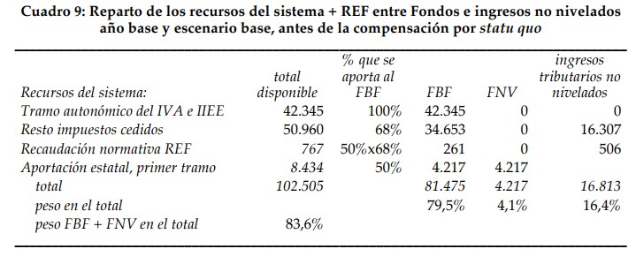 En este cuadro tenemos un resumen de los recursos del sistema de financiación tal y como saldría de la propuesta de los expertos (tomando el año 2015 como referencia en cuanto a las cifras de recaudación). El tramo autonómico de IVA e Impuestos Especiales va a la bolsa común. Del resto de impuestos cedidos (IRPF, Impuesto sobre Transmisiones Patrimoniales y Actos Jurídicos Documentados, Impuesto sobre Sucesiones y Donaciones, Tributos sobre el Juego y Tasas...): el 68% irían al fondo común y el resto se lo quedaría cada región.