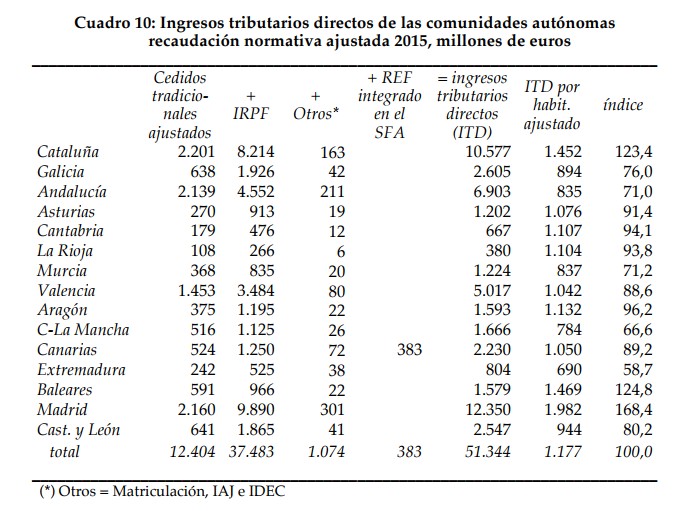 Como era previsible, las diferencias entre lo que se recauda son enormes. Tomando un valor 100 de media para estas regiones de régimen común, Madrid tendrá un valor de 168,2 (hablamos de los Ingresos Tributarios Directos, quedan fuera IVA e IIEE) y Extremadura de 58,7. Como decimos, no son todos los impuestos que forman parte del sistema de financiación, pero sí nos dan una idea de la capacidad recaudatoria de cada región.