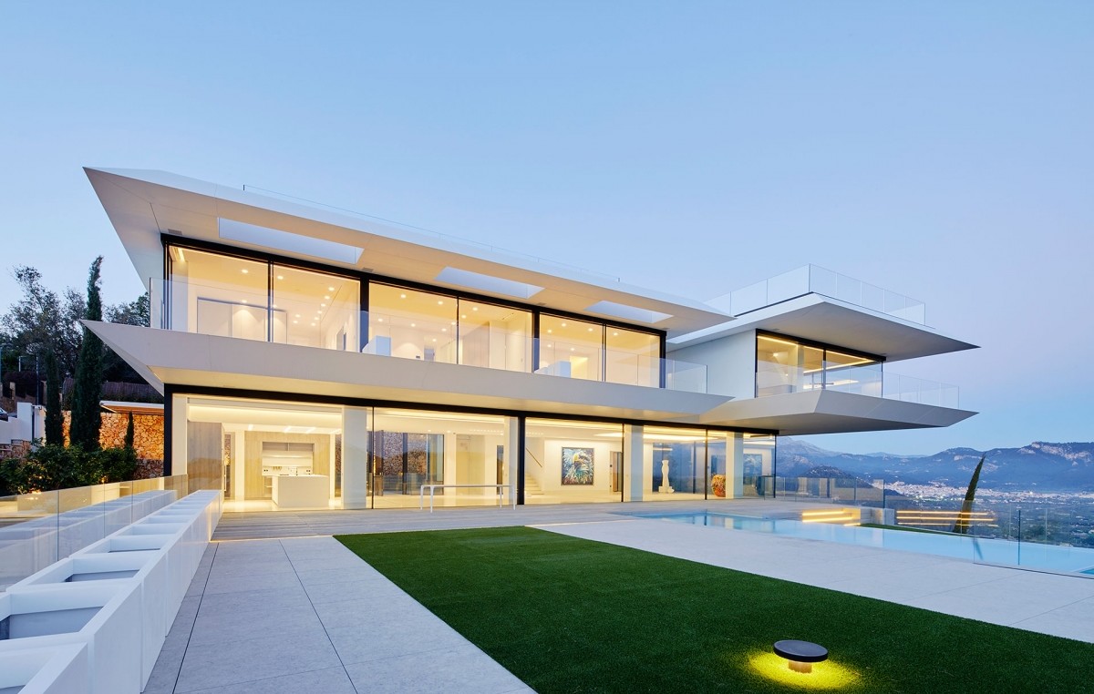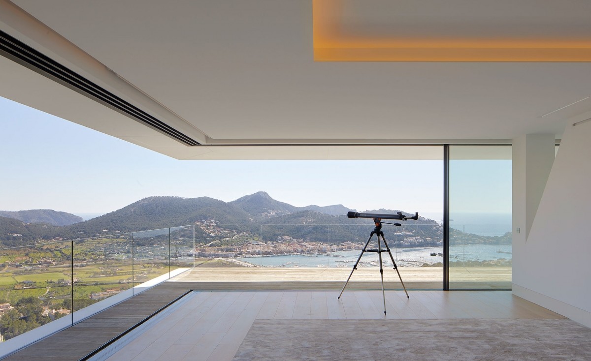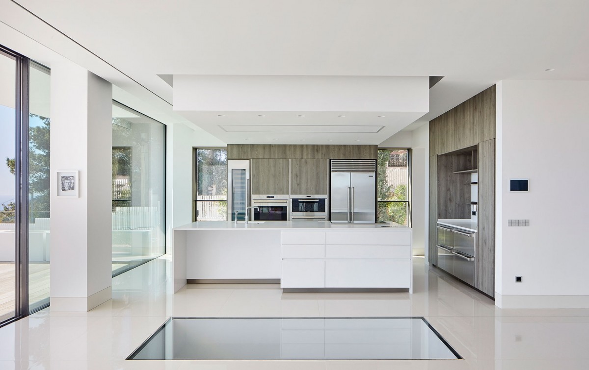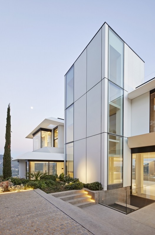 Las vistas de la vivienda dan al valle y al mar. Todos los pisos de la casa están conectados a través de un núcleo central con un ascensor de cristal y una escalera flotante