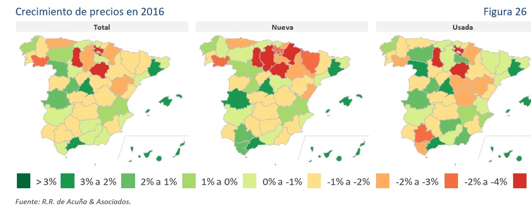 En general, los precios muestran tendencias más dinámicas y positivas en las principales áreas de influencia metropolitana y de costa turística, siendo las Islas Baleares, Barcelona, Madrid, Málaga e Islas Canarias las provincias que encabezan el crecimiento de precios, con tasas medias de entre el 5,8% y 3,8%. Las mayores caídas, por el contrario, se dan en Soria, Palencia, Álava, Orense y Navarra, con caídas de entre -3,5% y -1,9%.