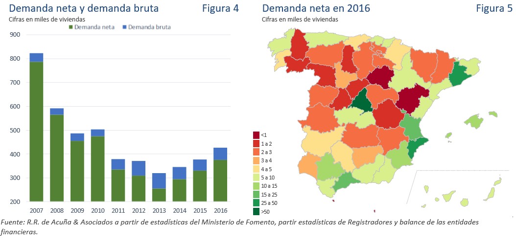 La demanda neta de vivienda, por su parte, mantiene el ritmo de crecimiento iniciado en 2014, con una tasa interanual del 13% en 2016, alcanzando las 375.000 unidades. Esta cifra recoge la autopromoción de viviendas más la compra neta de inmuebles, es decir, habiendo eliminado del cómputo las 35.000 que han comprado bancos y fondos de inversión (demanda no finalista).