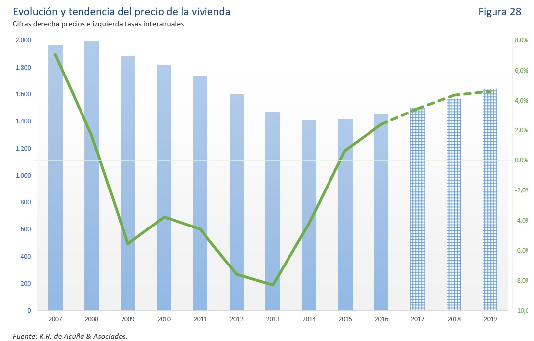 El precio de la vivienda es el principal indicador de la actividad inmobiliaria y, por tanto, sirve como termómetro para medir el grado de recuperación de este sector a nivel nacional. Así, tras siete años de caídas continuadas de precios a partir de 2007, la buena marcha de la economía y la creación de empleo están impulsando al alza la demanda de pisos, con la consiguiente subida de precios. En concreto, el aumento medio se situó en el 2,4% interanual en 2016, según el último Anuario Estadístico del Mercado Inmobiliario Español publicado este jueves por la consultora R.R. de Acuña & Asociados.