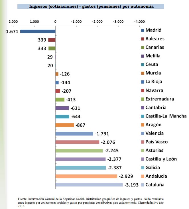 Hace unos meses, Convivencia Cívica Catalana (CCC) presentaba su informe Las Pensiones en las autonomías en el que intentaba recopilar la información más relevante sobre la situación de la Seguridad Social en las diferentes regiones en 2015, último ejercicio para el que disponemos de datos definitivos. De nuevo, no es una cifra cerrada, ni mucho menos, pero sí puede ser un primer paso para el debate. El gráfico fundamental del estudio es el siguiente: