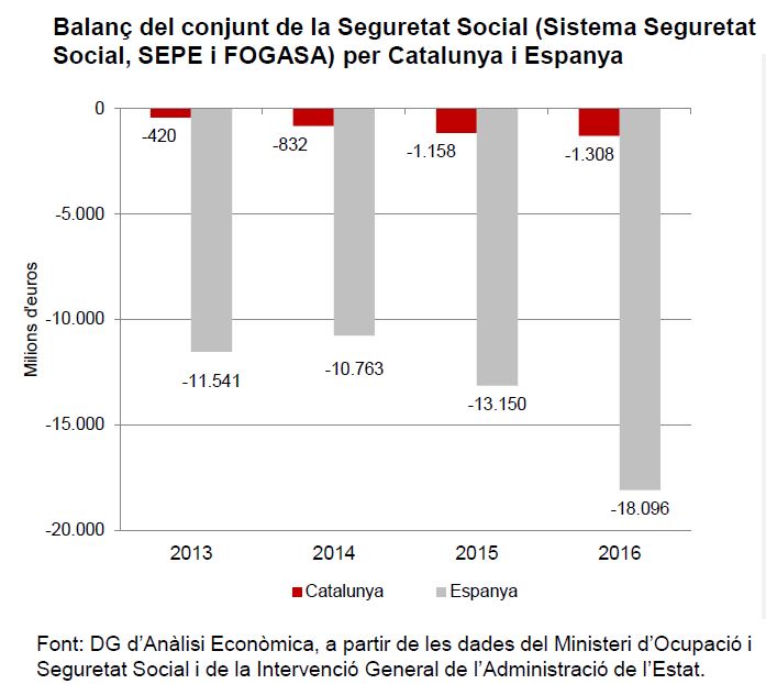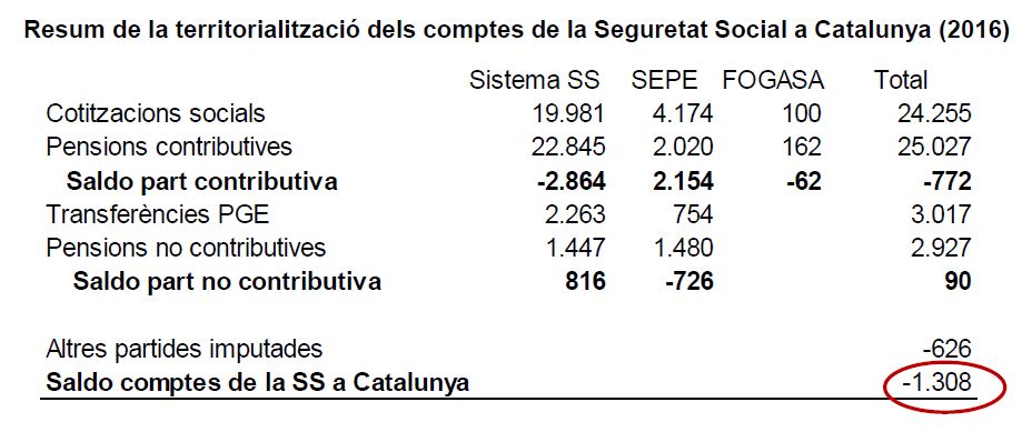 Todo parece más o menos normal. En la primera tabla aparecen las cifras del sistema de la Seguridad Social, del Servicio Público de Empleo Estatal (SEPE) y de Fogasa territorializadas para Cataluña. Es decir, qué parte de los ingresos y gastos de estos organismos se recauda y se abona en la región. ¿Saldo final?: 1.308 millones de euros.