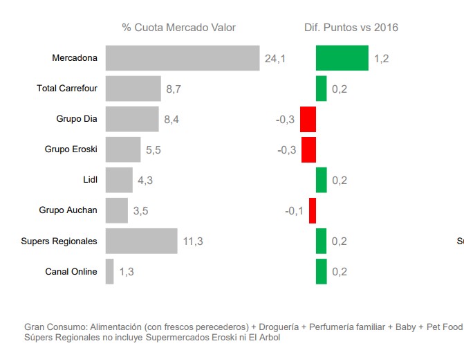 Con un aumento de 1,2 puntos respecto al acumulado de 2016, la empresa fundada por Juan Roig recupera así el liderazgo en crecimiento tras 2 años de leves ascensos, donde sólo crecía en la sección de frescos. Según el informe, "la renovación de sus establecimientos, la introducción de propuestas saludables y la apuesta por las marcas exclusivas" son los motivos que explican que la compañía haya registrado el mayor crecimiento desde el año 2012.