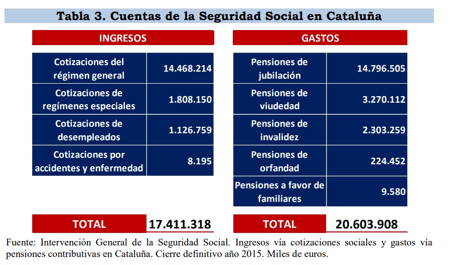 Para empezar, podríamos analizar cuáles son realmente los ingresos y gastos en cotizaciones sociales y prestaciones contributivas en Cataluña. Debiera parecer sencillo. Pero no lo es. Como veíamos la pasada semana, ni siquiera en esto hay acuerdo. La Generalidad coge cifras del subsidio del paro para limitar los números rojos y habla de un déficit de 1.300 millones; mientras, el Gobierno central le atribuye a la región 4.900 millones negativos (más del 25% del déficit total del sistema). A mitad de camino, Convivencia Cívica, con los datos del año 2015, presenta estas cifras: