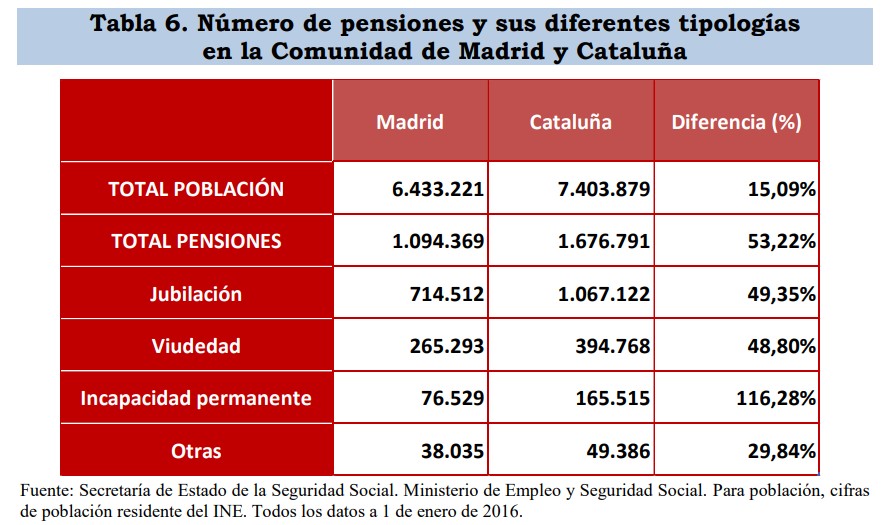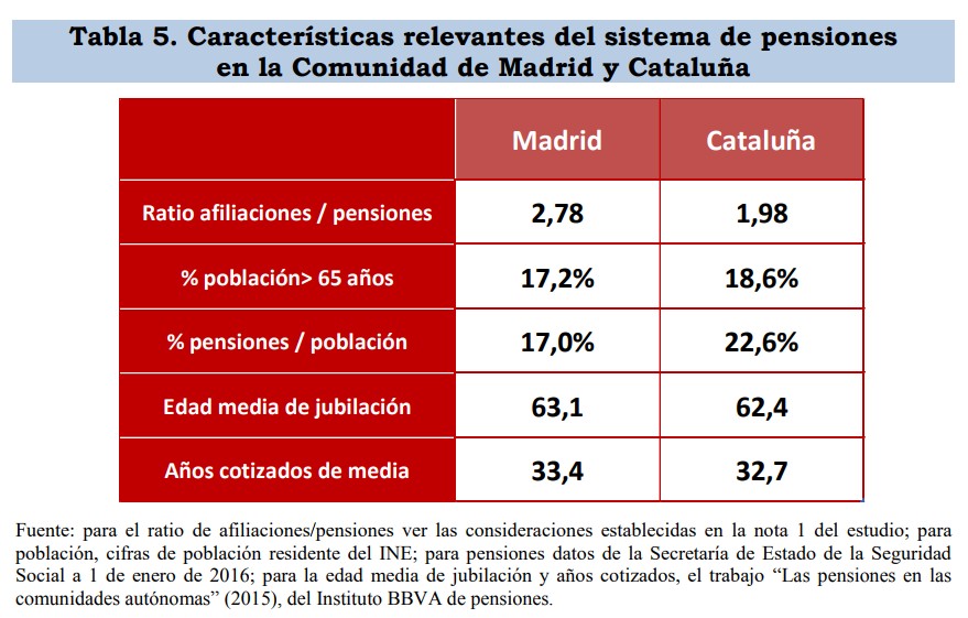 En realidad, con todos estos datos encima de la mesa, lo que se intuye es una situación financiera, en lo que tiene que ver con las pensiones, más o menos en la media española. Ni mucho menos Cataluña es una de las regiones con más déficit en relación a su población ni más problemas de sostenibilidad (por ejemplo, Asturias, Galicia o Castilla y León, si se independizaran, con una población muy envejecida, tendrían un déficit en pensiones al que no podrían hacer frente). Pero cuidado, también es verdad que la Seguridad Social en Madrid, una región similar en cuanto a población, estructura productiva o renta, tiene una situación financiera mucho más saneada que la de Cataluña (ver los siguientes dos cuadros del informe de CCC):