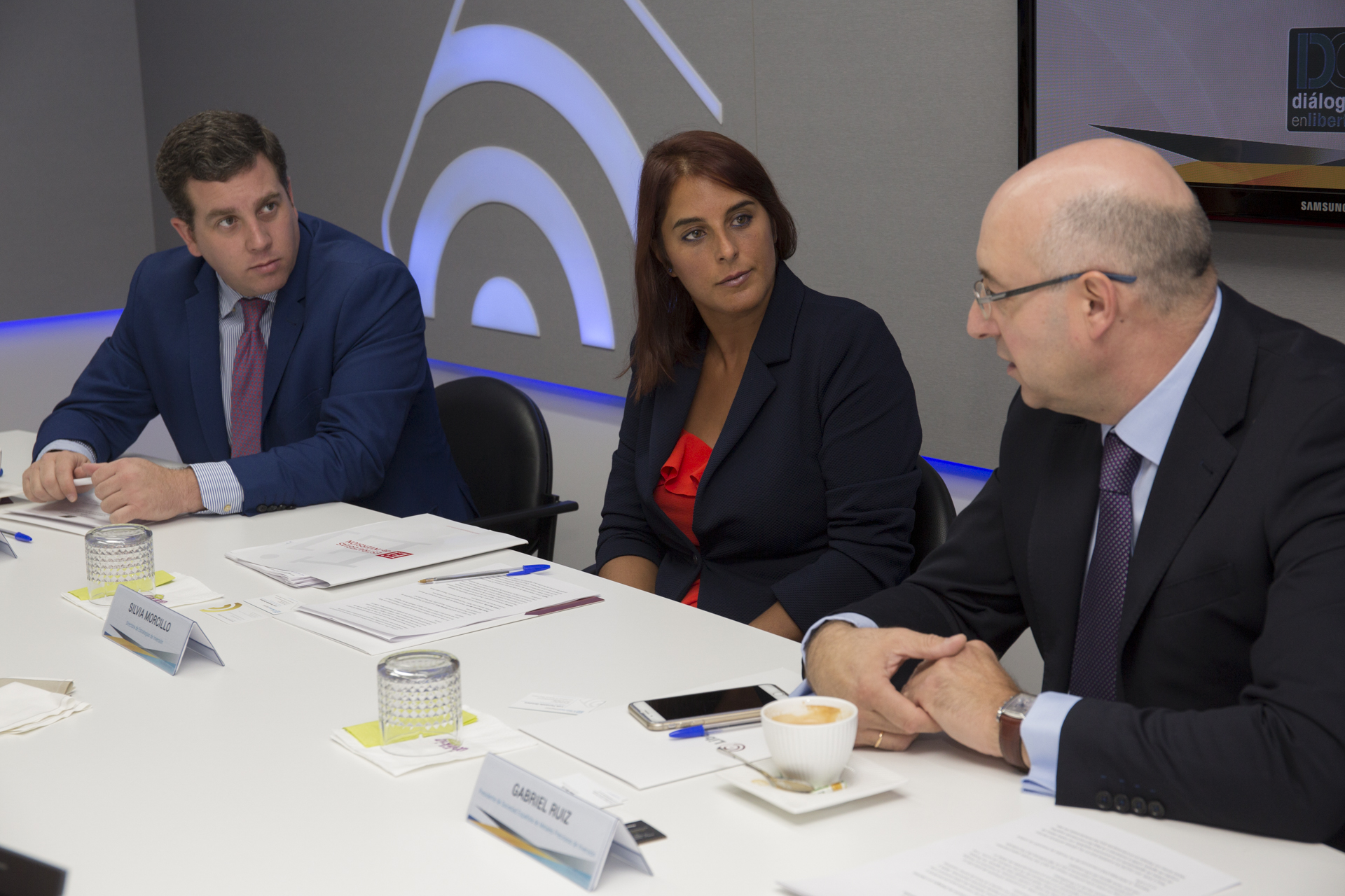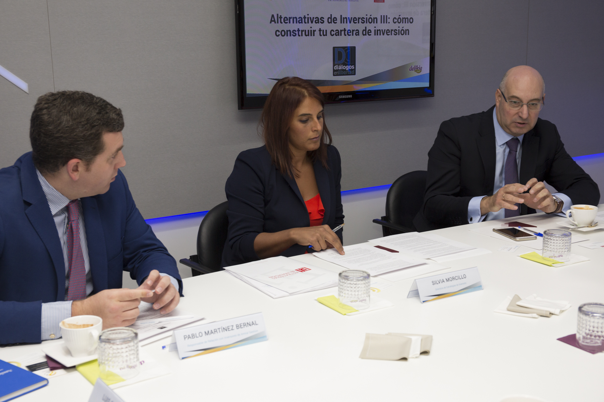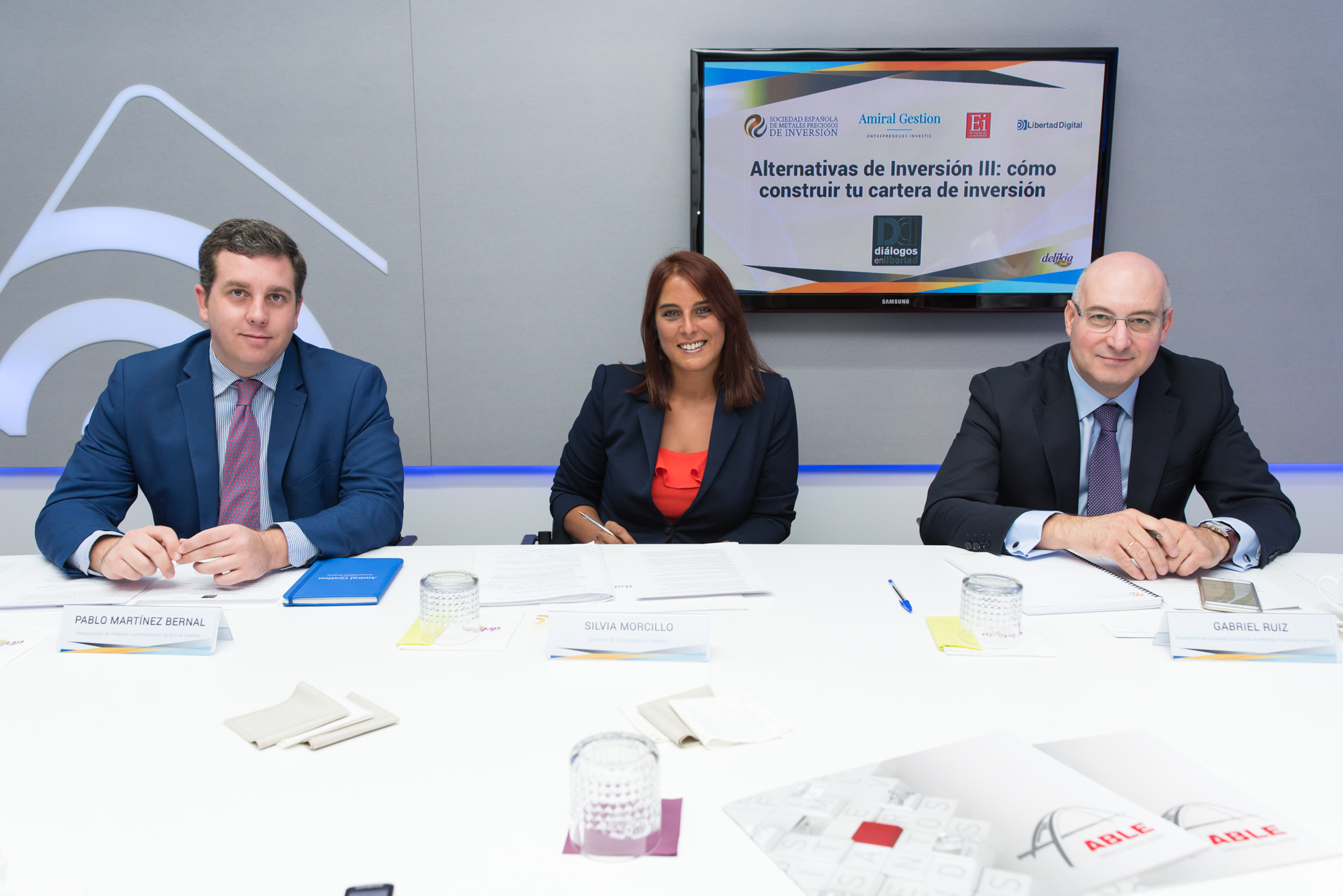Los participantes en la nueva mesa de Diálogos, Gabriel Ruiz, de Sociedad Española de Metales Preciosos de Inversión, Pablo Martínez Bernal de la gestora de fondos Amiral Gestion y Silvia Morcillo, directora de Estrategias de Inversión.