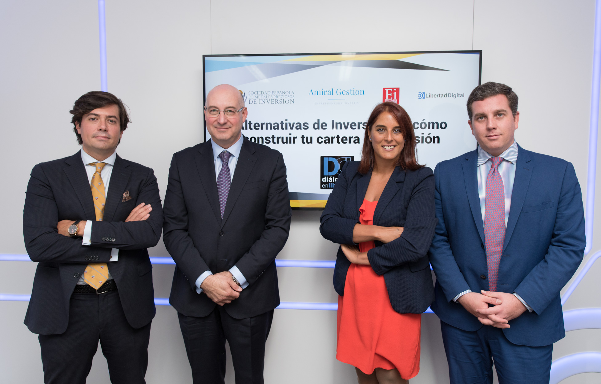 Luis Fernando Quintero junto a los protagonistas, Gabriel Ruiz, de Sociedad Española de Metales Preciosos de Inversión, Pablo Martínez Bernal de la gestora de fondos Amiral Gestion y Silvia Morcillo, directora de Estrategias de Inversión.