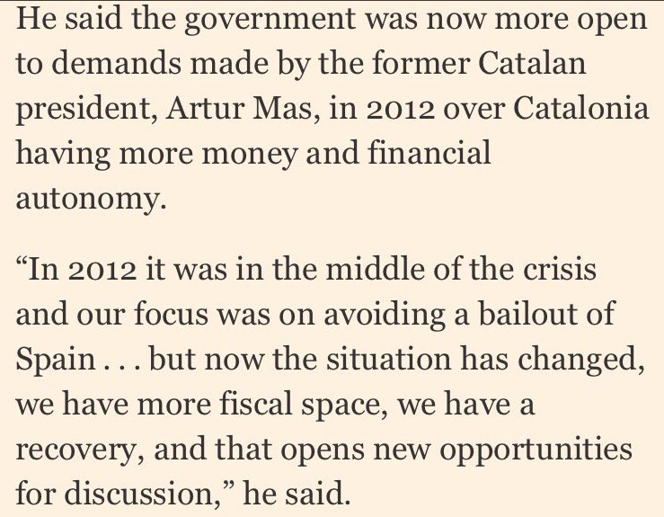 "En 2012, estábamos en mitad de la crisis y la atención estaba puesta en evitar el rescate de España, pero ahora la situación ha cambiado, tenemos más espacio fiscal, hay una recuperación y eso abre nuevas oportunidades para la discusión […] Cataluña ya tiene una gran autonomía, pero podríamos hablar de una reforma del sistema de financiación y otras cuestiones".