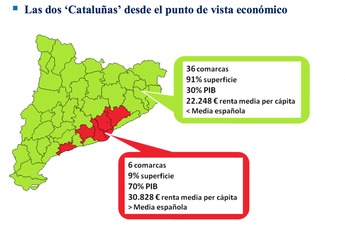 Esta situación contrasta con una Cataluña mucho más próspera, representada por apenas 6 de las 42 comarcas de la autonomía. Estas demarcaciones concentran apenas el 9% de la superficie de la región y abarcan Barcelona y sus alrededores. En suma, producen el 70% del PIB y disfrutan de una renta media de 30.828 euros.