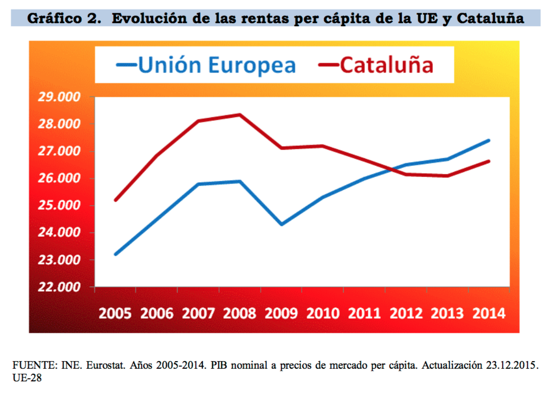 CCC también explica en su informe que la renta media de la comunidad, indicador que aglutina a la Cataluña rica con la Cataluña pobre, viene de sufrir un retroceso histórico entre los años 2011 y 2012. Hasta entonces, el ingreso per cápita de los catalanes se situaba por encima del promedio europeo. Sin embargo, ese diferencial positivo se ha invertido y ahora Cataluña tiene un saldo negativo con la UE en términos de renta.