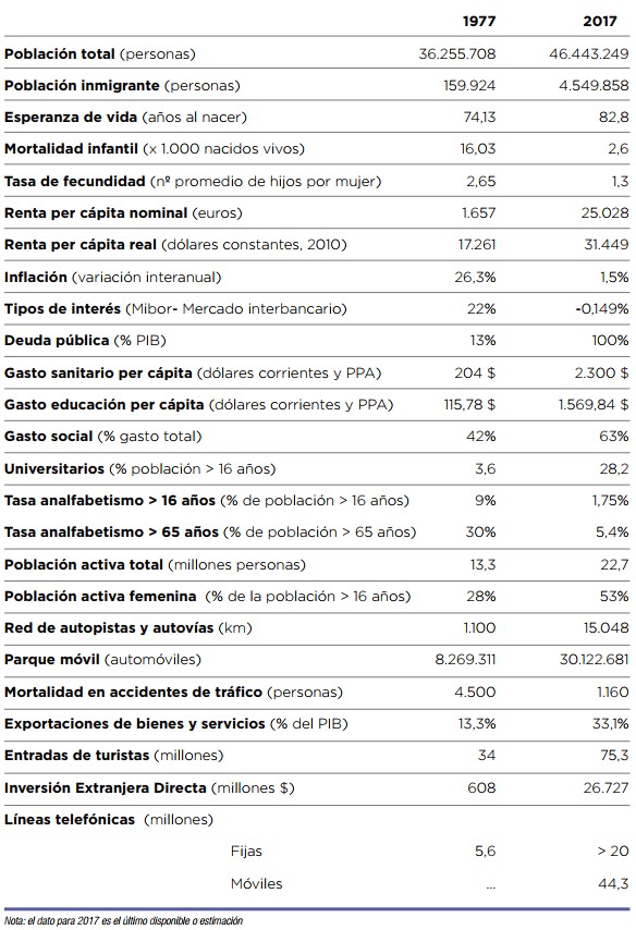 La incorporación de la mujer al mercado laboral es ya una realidad, puesto que la población activa femenina ha crecido del 28% al 53%. A su vez, el modelo productivo se ha terciarizado, como en el resto de las economías avanzadas, concentrando el sector servicios el 75% del empleo, frente al 42% de 1977. Las exportaciones han aumentado de 13,3% al 33,1% del PIB, destacando el papel de las multinacionales españolas líderes a nivel mundial. La llegada de turistas internacionales ha pasado de 34 a más de 75 millones al año y la inversión extranjera directa ha crecido de apenas 608 millones de dólares a más de 26.700 al año.
