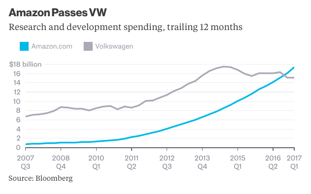 Increíble, pero cierto. El gasto en I+D de Amazon ya supera al de Volkswagen. Hace apenas un lustro, la empresa de Jeff Bezos solo desembolsaba unos 2.000 millones anuales por este concepto. Sin embargo, su presupuesto anual para actividades de Innovación y Desarrollo ha llegado ya a los 18.000 millones de dólares, superando al gigante gigante de la automoción alemana, que consigna a esta partida algo menos de 16.000 millones por ejercicio.