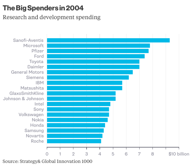 Si echamos la vista atrás podemos ver cómo han cambiado las cosas. El ranking de Bloomberg para 2004 colocaba en cabeza a Sanofi-Aventis, seguida de Microsoft, Pfizer, Ford, Toyota, Daimler, General Motors, Siemens, IBM y Matsushita. También aparecían en las primeras posiciones GlaxoSmithKline, Johnson & Johnson, Intel, Sony, Volkswagen, Nokia, Honda, Samsung, Novartis y Roche.