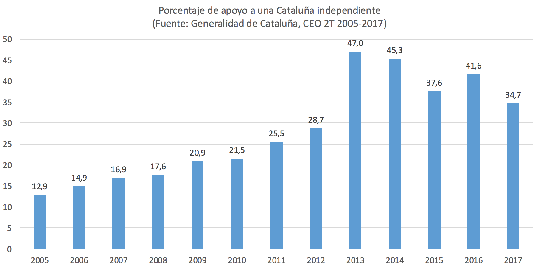 En 2005, cuando se publicó por primera vez el Barómetro de Opinión Política, apenas un 12,9% de los catalanes se manifestaba partidario de la secesión. Hoy, ese porcentaje es claramente superior y llega al 34,7%. Pero sería un error pensar que el separatismo ha experimentado un crecimiento ininterrumpido. De hecho, los niveles de apoyo al soberanismo observados en 2017 son los más bajos en cinco años.