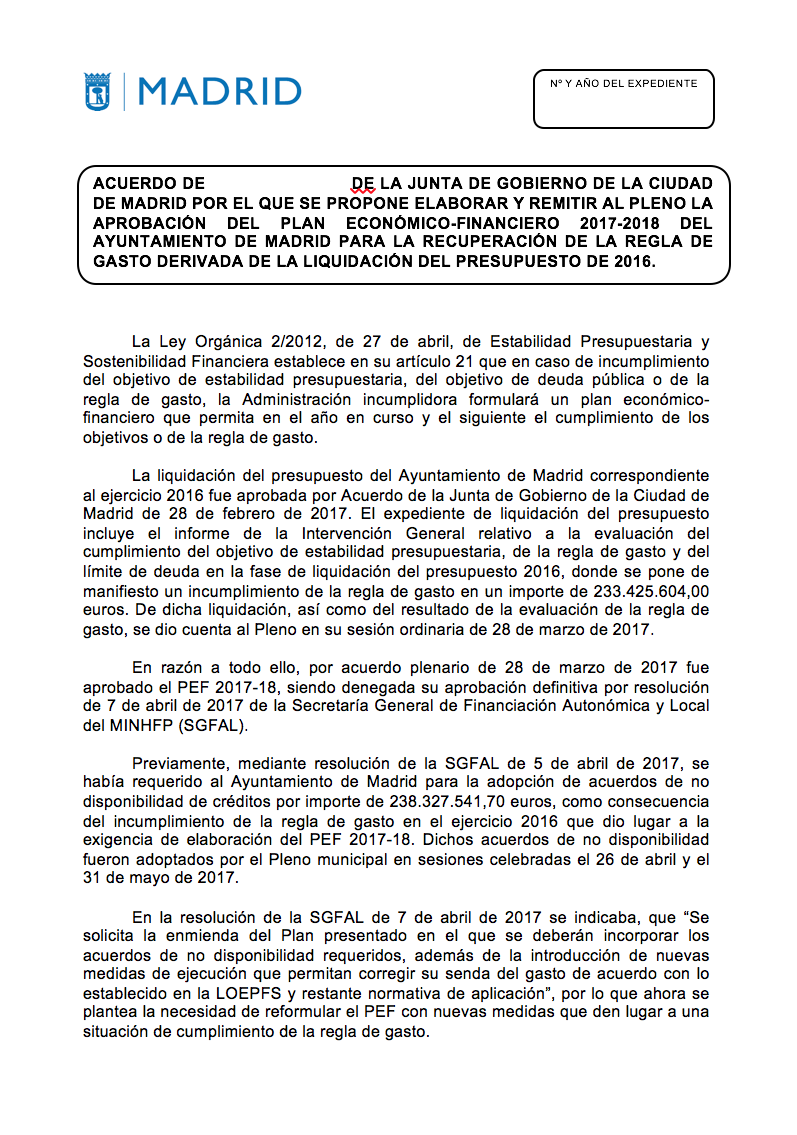 A través de este documento firmado por la Junta de Gobierno, el consistorio admite que "la liquidación del presupuesto correspondiente al ejercicio 2016" incluía un informe adjunto en el que la Intervención General ya advertía del incumplimiento de los objetivos fiscales. Para ser precisos, el gabinete de Ahora Madrid reconoce que, desde al menos el 28 de febrero de 2017, el consistorio estaba notificado de que la Regla de Gasto había sido violada en un importe de 233,4 millones de euros.
