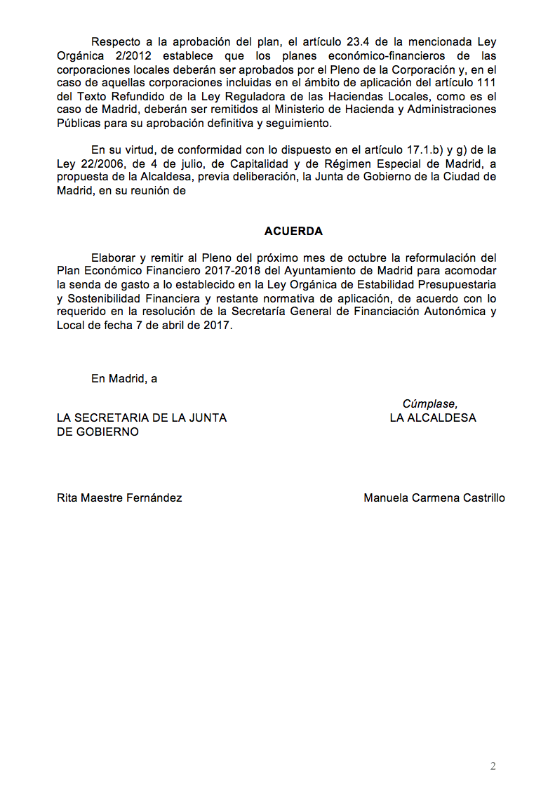 Ahora, en un acuerdo firmado por Manuela Carmena y Rita Maestre, el gobierno de la capital anuncia que se prepara para "elaborar y remitir al Pleno de octubre la reformulación del Plan Económico-Financiero para 2017-2018", con el objetivo de "acomodar la senda de gasto a lo establecido en la Ley Orgánica de Estabilidad Presupuestaria y Sostenibilidad Financiera". De hecho, el equipo municipal afirma en este acuerdo que las modificaciones en los planes presupuestarios "se ajustarán a lo requerido en la resolución de la Secretaría General de Financiación Autonómica y Local".