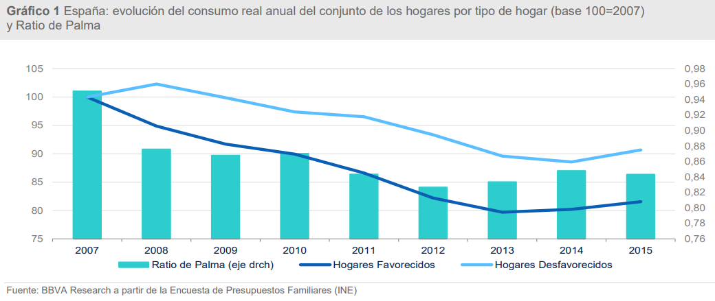 Pero no fue así. Las familias más favorecidas redujeron su consumo total un 17,2% entre 2007 y 2015, mientras que sólo cayó un 7,6% entre las menos favorecidas. De este modo, el ratio de Palma, que mide la desigualdad en términos de consumo, bajó un 9,7% durante la crisis.