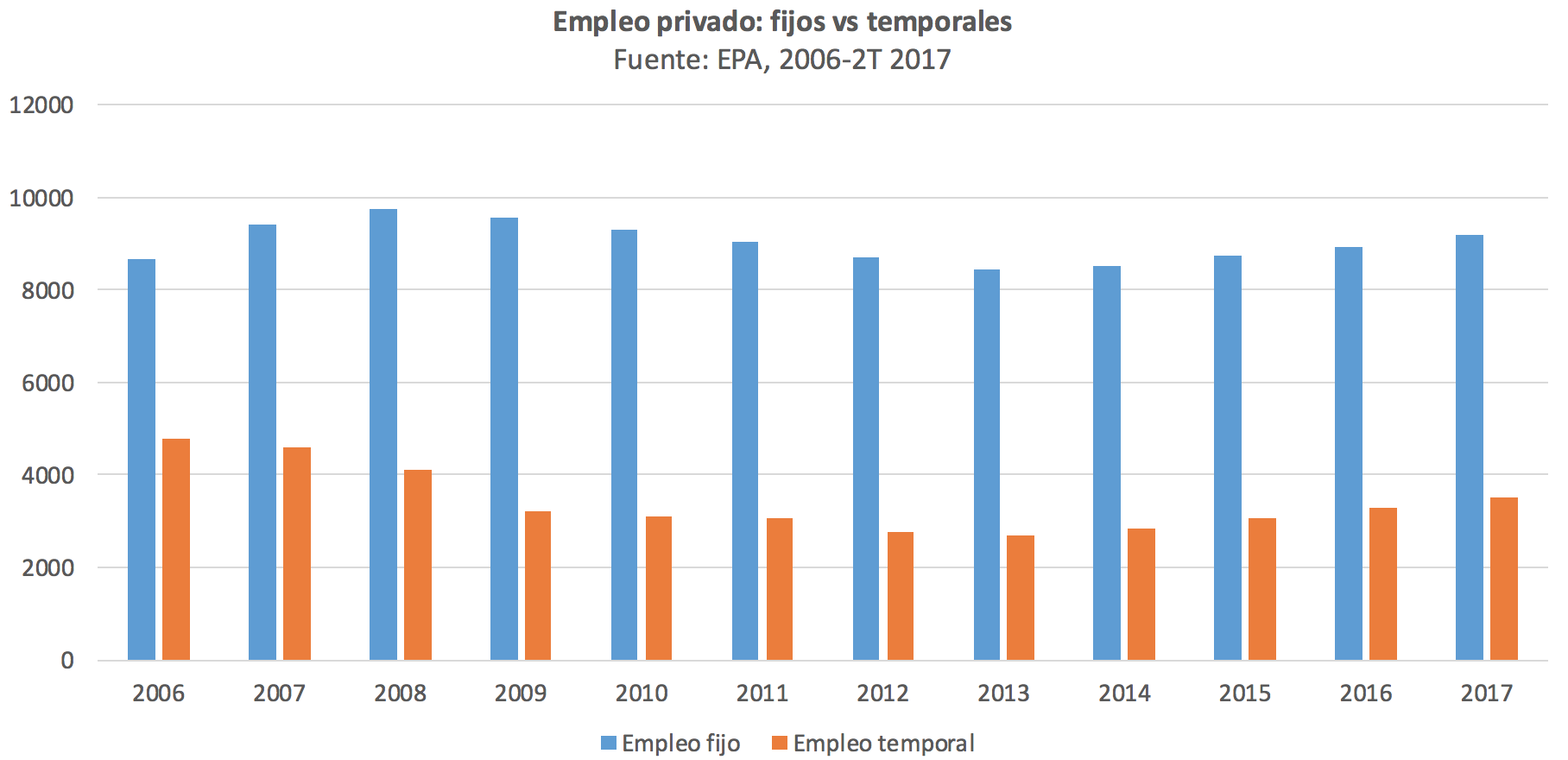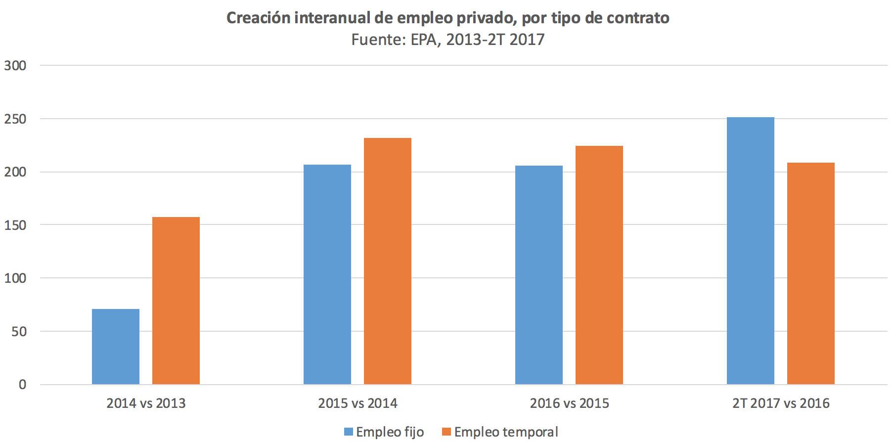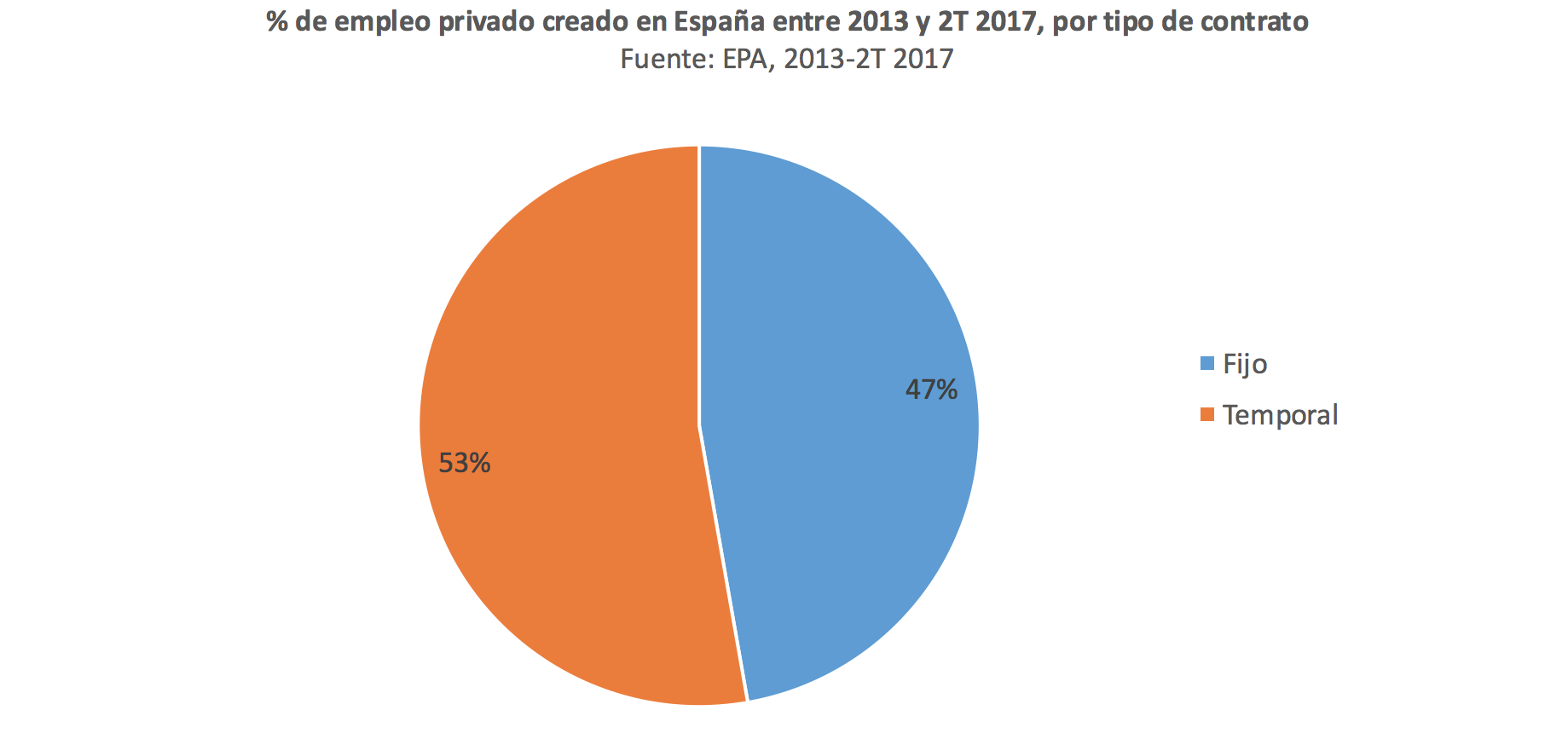 Si tomamos los datos de ocupación del sector privado, vemos que el empleo ha crecido en 1,5 millones de personas entre 2013 y el segundo trimestre de 2017. De esa cifra, 735.000 puestos de trabajo corresponden a contratos de duración indefinida, mientras que 821.000 están ligados a acuerdos temporales. De modo que casi la mitad del empleo generado desde que empezó la recuperación es fijo. Para ser precisos, un 47,2% tiene duración indefinida y un 52,8% viene con fecha de de finiquito.