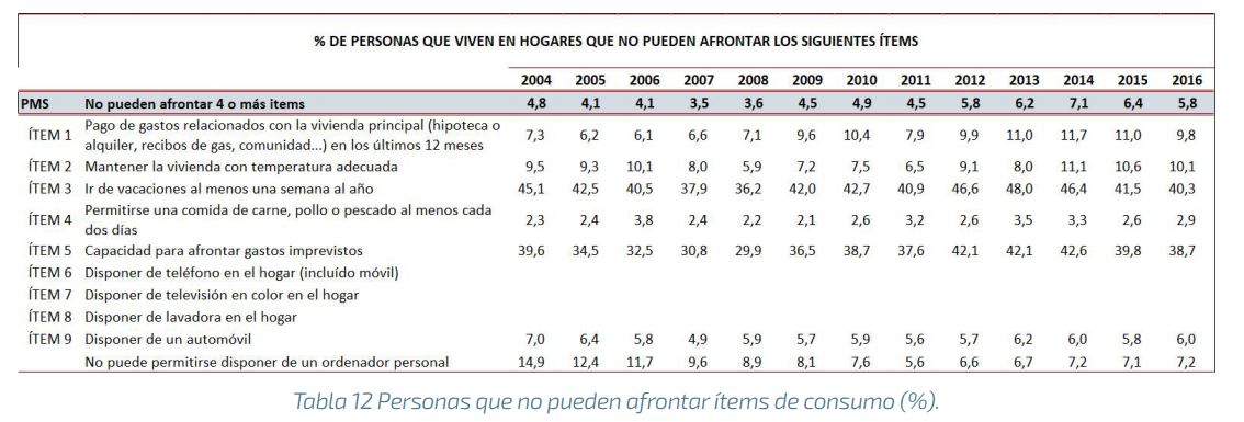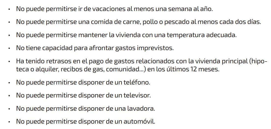 EAPN-EspañaCarencia material severa: personas que están incluidas en cuatro de las nueve categorías del listado de la imagen derecha. En realidad, en España sólo cuentan seis categorías, porque para tres de ellas (tener un teléfono móvil, tener un TV en color y tener lavadora) se considera que apenas hay población sin acceso a estos bienes (ver páginas 44 y 45 del informe de 2017El estado de la pobreza, que publica European Anti Poverty Network).