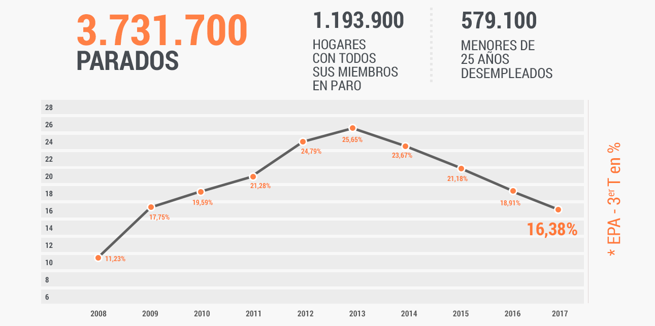 El paro baja este trimestre en 182.600 personas (-4,66%), hasta un total de 3.731.700, su nivel más bajo desde el cuarto trimestre de 2008.