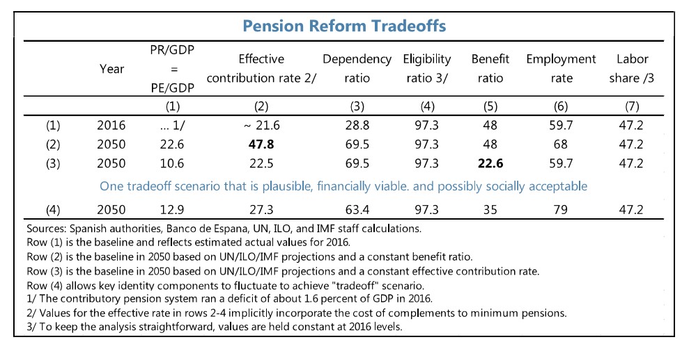 El envejecimiento de la población española, con el incremento asociado del ratio de dependencia (pensionistas / trabajadores) del 29 al 69%, supondría que el gasto en pensiones respecto del PIB se doblaría, pasando a suponer un 22,5% del PIB en 2050. Para mantener el sistema de pensiones en equilibrio financiero, las cotizaciones deberían incrementarse en veinte puntos. En otras palabras, para mantener la tasa de sustitución actual entre pensiones y salarios, habría que incrementar las cotizaciones hasta que supusieran casi la mitad de cada salario. A la inversa, si mantenemos las cotizaciones sociales cercanas a su nivel de 2016, habría que reducir la relación pensiones/salarios en 25 puntos.