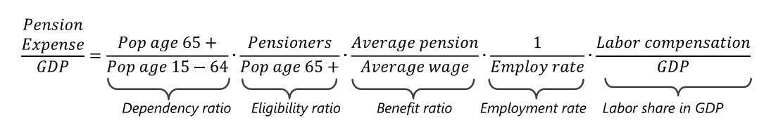 Los cálculos del FMI se basan en las dos gráficas que podemos ver a continuación. La primera es la ecuación que determina el gasto en pensiones. Es un poco más compleja, pero no muy diferente en el planteamiento de la que Libre Mercado proponía hace unos meses.