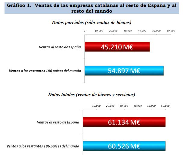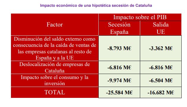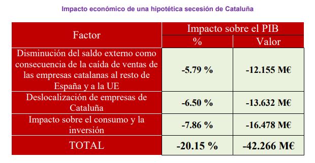 - En lo que hace referencia al coste de la separación de España, "asumimos una caída media en cuatro años de las ventas catalanas al resto de España del 50%, es decir, en el punto medio del intervalo entre el 33% y el 66% que ha sido estadísticamente verificado a nivel internacional en casos de secesión. Se trata de una estimación conservadora ya que en los casos reales de separación que han tenido lugar en Europa en los últimos 25 años la caída de las ventas de las empresas del territorio separado ha sido, tal como hemos visto, en un porcentaje superior al 50%, oscilando éste entre el 55% y el 65%".
