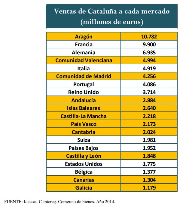 En 2014, último ejercicio para el que existen datos definitivos tanto de exportaciones como de ventas inter-regionales (los de 2015 y 2016 son estimaciones) las empresas catalanas exportaron más de 60.000 millones de euros, lo que supuso un récord histórico. Al igual que han hecho las compañías del resto de España, la crisis ha obligado a cientos de empresarios catalanes a mirar al mercado exterior. Mientras tanto, las ventas al resto de España, según los datos de C-Intereg ascendieron a 39.342 millones de euros. Con estas cifras, la cuenta es sencilla: más o menos el 60% de las ventas catalanas al exterior van al extranjero y el 40% restante se distribuye entre las otras 16 comunidades autónomas.