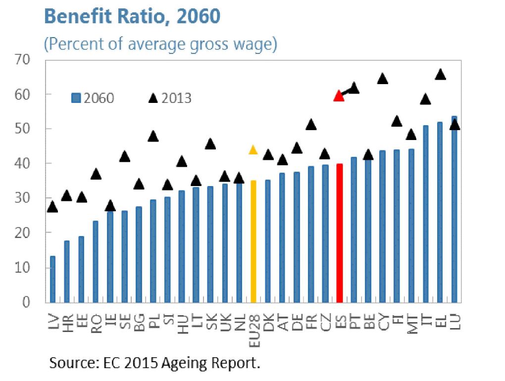 España está marcada en rojo y dos cuestiones destacan en nuestro caso: si miramos los triángulos, que reflejan la relación pensión/salario en 2013, estamos en el grupo de cabeza, junto a Grecia, Chipre y Portugal. Nuestro sistema de pensiones es uno de los más generosos del mundo en términos relativos, comparando con los salarios medios de la economía. Sin embargo, si miramos a las barras la cosa empeora bastante. Seguimos por encima de la media, pero muy poco. Y la diferencia entre triángulo y barra es la más grande, lo que quiere decir que la caída de esta ratio (pensión/salario) será la más elevada de entre todos los países europeos.