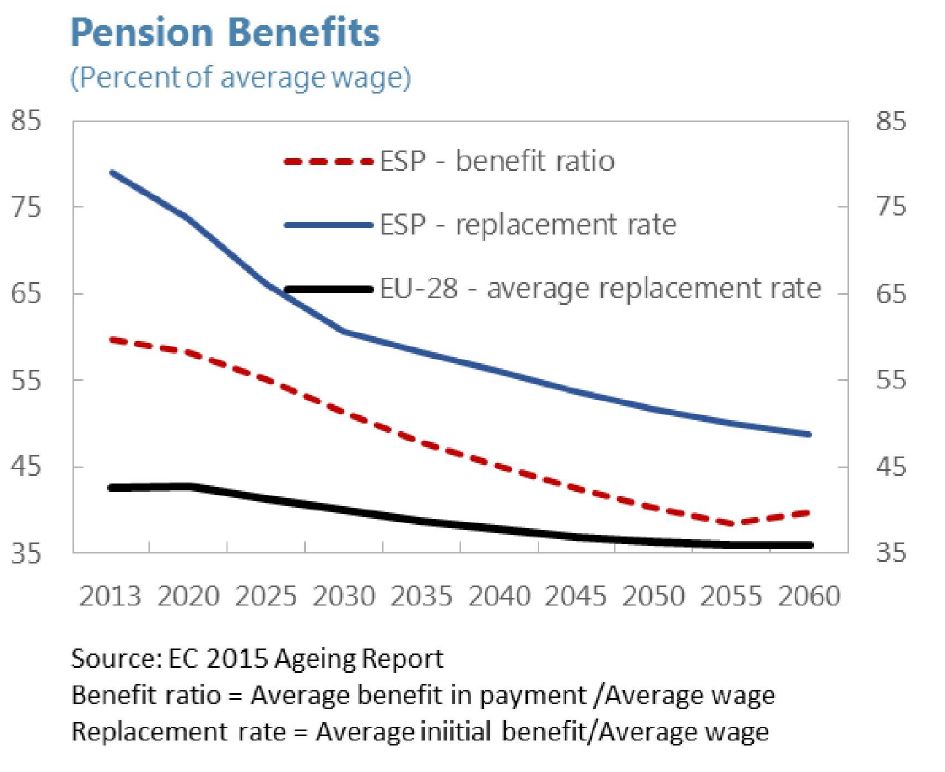 En este mismo informe, también nos encontramos el siguiente gráfico. Muestra cómo evolucionarán las dos principales ratios para los pensionistas. La tasa de sustitución o reemplazo (relación entre primera pensión cobrada y último salario percibido) y la tasa de beneficio (relación pensión media / salario medio). En ambos casos vemos que, aunque en la UE-28 cae ligeramente la ratio, en España se desploma en los dos casos.
