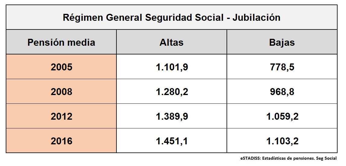 Junto al facto de los índices de revalorización, hay otro elemento que ha impulsado las rentas de los mayores de 65 años. La razón es que las nuevas cohortes de jubilados que se han incorporado a la Seguridad Social desde 2008 tienen pensiones mucho más elevadas que las de las bajas por fallecimiento. Esto es lógico: según avanza el tiempo, van llegando al retiro las generaciones con carreras laborales más largas y bases de cotización más elevadas. En la siguiente tabla, puede verse cómo han evolucionado las pensiones medias de las nuevas altas y bajas del sistema. Es lógico, por tanto, que los mayores de 65 años ganen más ahora que en 2008. Aquí hay un efecto estadístico que no siempre se tiene en cuenta: los jubilados de 2016 no son las mismas personas (algunos sí, claro... pero otros muchos no) que los jubilados de 2008.