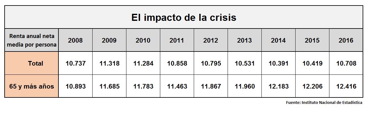 Sin embargo, dentro del escenario general de caída de ingresos y empeoramiento de las condiciones de vida, puede decirse que hay un grupo que ha capeado algo mejor el temporal: los pensionistas y mayores de 65 años. Eso no quiere decir que no haya viudas que apenas puedan llegar a fin de mes con su prestación o que no haya miles de personas cobrando pensiones apenas por encima del salario mínimo. Pero en términos relativos, sí puede decirse que la crisis ha sido algo menos dura con ellos.