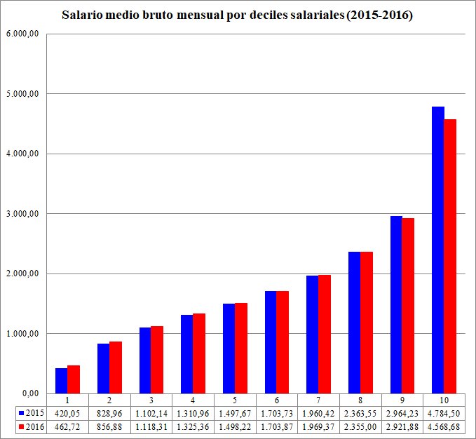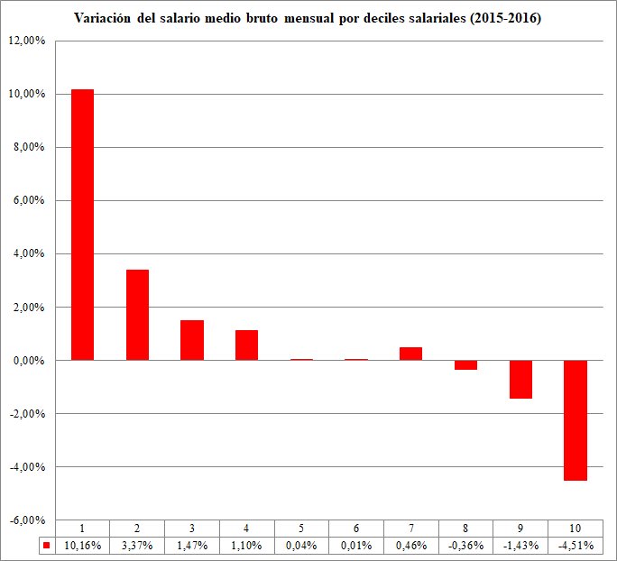 En contra de lo que cabría esperar, ninguno de los partidos políticos o sindicatos se ha molestado en analizar esta bajada con detenimiento para ver qué parte de la distribución salarial sube y cuál se reduce. Ése es justamente el propósito del siguiente gráfico, en el que se muestra el salario medio bruto mensual por deciles de la distribución salarial en 2015 y en 2016.
