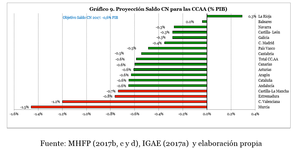 En este sentido, cabe recordar que el objetivo de déficit autonómico tan sólo se ha reducido una décima, pasando del 0,7% del PIB en 2016 al 0,6% actual, de modo que el mayor incremento de la recaudación compensará el aumento del gasto e incluso permitirá cumplir con el citado límite.