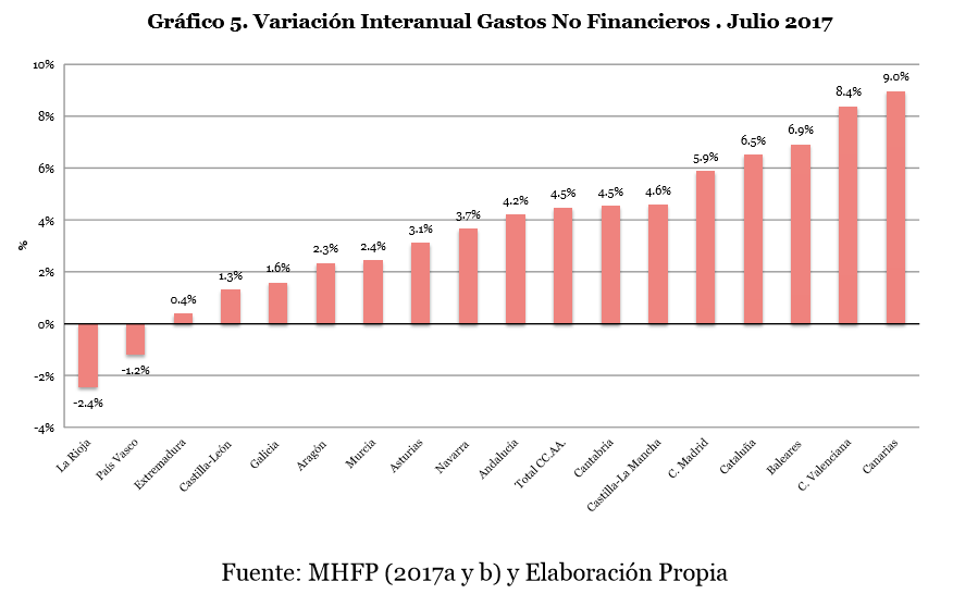 De hecho, si se dejan a un lado las previsiones, se observa que, hasta el pasado mes de julio, un total de 12 gobiernos autonómicos incumplían la regla de gasto. Según los últimos datos de ejecución presupuestaria, el gasto regional en términos homogéneos aumentaba a un ritmo del 4,5% interanual, muy por encima del límite del 2,1% fijado por la Ley de Estabilidad. Canarias (9%), Comunidad Valenciana (8,4%) y Baleares (6,9%) son las que presentan un mayor aumento, seguidas de Cataluña, Madrid, Castilla-La Mancha, Cantabria, Andalucía, Navarra, Asturias, Murcia y Aragón. En el lado opuesto se situaban La Rioja (-2,4%), País Vasco (-1,2%) y Extremadura (0,4%), Castilla y León (1,3%) y Galicia (1,6%).