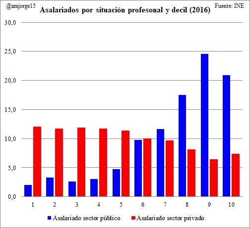 Casi un 21% de los asalariados públicos se encontraban dentro del 10% que más ganaba, mientras que solo un 7,3% de los privados ocupaban esa posición, y casi el 45% entre el 20% que disfruta de mayores sueldos. De igual modo, el porcentaje en el 10% que menos gana era completamente inverso, puesto que solo un 2% de los asalariados públicos se encontraba en ese grupo frente al 12% de los privados.