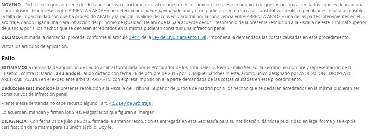 Dichas sentencias del TSJ llaman la atención sobre la coincidencia en la sede social de AEADE y ARRENTA y en el conflicto de intereses que se produce cuando el árbitro que media en un conflicto es árbitro y parte.