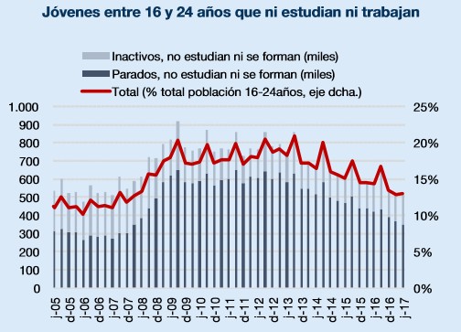 Pese a ello, el número de ni-nis ha caído de forma sustancial en los últimos años, ya que llegó a superar la cota del 20% en los peores momentos de la crisis. En concreto, según los últimos datos publicados por la patronal de empresas de trabajo temporal, Asempleo, este colectivo se ha reducido un 14,5% desde mediados de 2015, regresando a los niveles observados justo al inicio de la crisis.