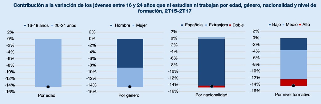 Dicho descenso se ha concentrado, especialmente, entre los jóvenes de 20 a 24 años, ya que los que tienen entre 16 y 19 años se mantienen desde 2015 en el entorno de las 145.000 personas. Por nacionalidad, son eminentemente los españoles los que, además de nutrir el número de ni-nis, también explican la mayor parte de la reducción del colectivo en estos dos últimos años. Por el contrario, los de nacionalidad extranjera se han mantenido en el entorno de las 120.000 personas desde 2015. Asimismo, por nivel de formación, la mayor caída se produce entre los que tienen educación media, es decir, aquellos que, al menos, han completado Secundaria.