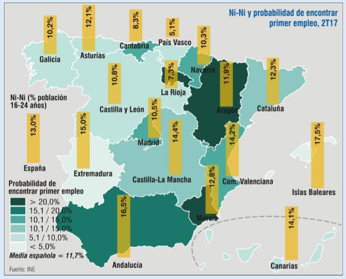 Sin embargo, a pesar de este descenso generalizado, siguen existiendo grandes diferencias entre las CCAA. Así, Baleares, con un 17,5% de ni-nis, Andalucía, con un 16,5%, y Extremadura con un 15%, lideran este particular ranking a nivel nacional.