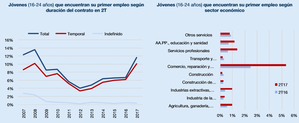 El sector en el que es más probable que los jóvenes encuentren su primer empleo y donde más ha aumentado esta probabilidad en el último año es en el comercio, la reparación y la hostelería. "Este es, precisamente, el que mayor dinamismo de creación de empleo está mostrando en los últimos meses, por lo que se podría decir que su favorable evolución está haciendo partícipe al colectivo de trabajadores jóvenes, ofreciéndoles su primera oportunidad laboral", según concluye el informe.