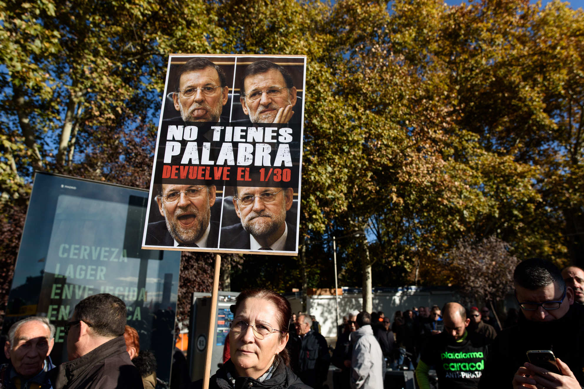 Una pancarta reivindicativa con fotografías de Mariano Rajoy.